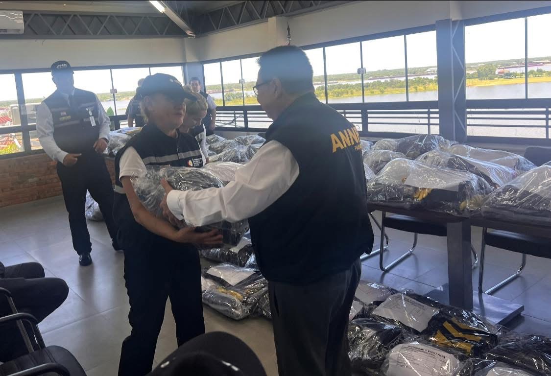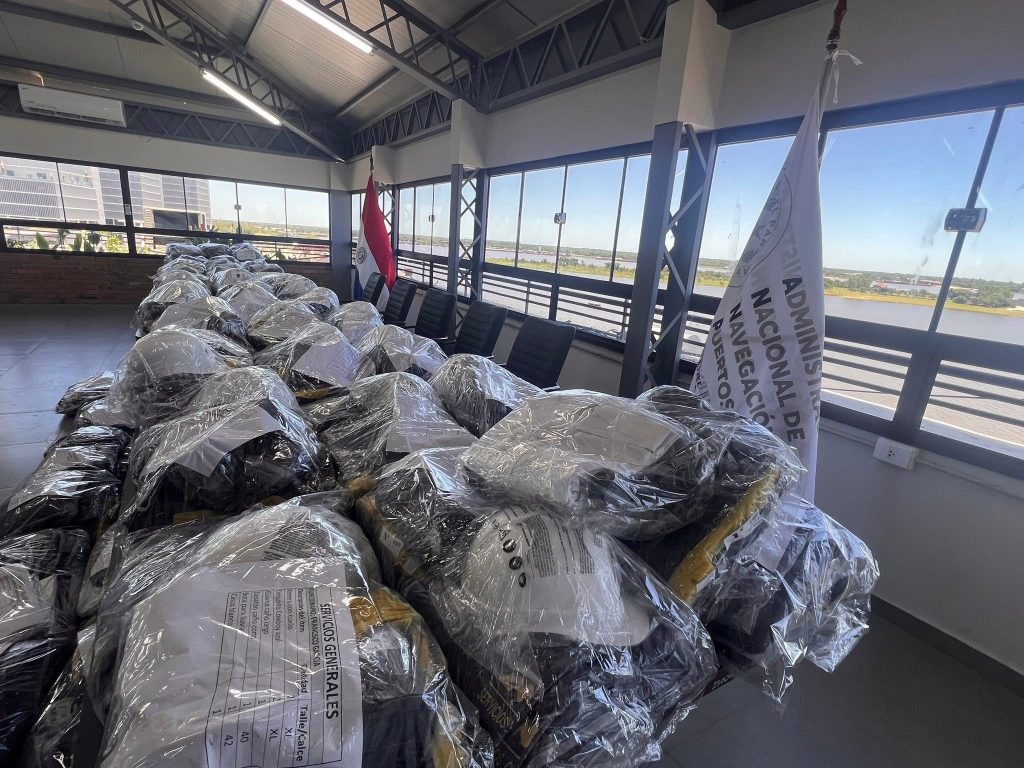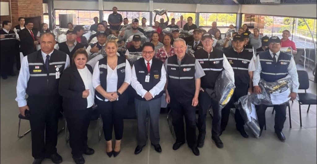El Presidente de la Institución, Ing. Julio César Vera Cáceres, la Jefa de Gabinete, Dra. Laura Battilana, el Gerente de Obras, Ing. Carlos Saldivar, el Administrador de la Sede Asunción, Gustavo Gauto y la Jefa de Servicios Generales, Justina Lopez, realizaron la correspondiente entrega a los funcionarios que incluyó, además de los uniformes propiamente dichos, chalecos, kepis, pilotos y botas para lluvia.